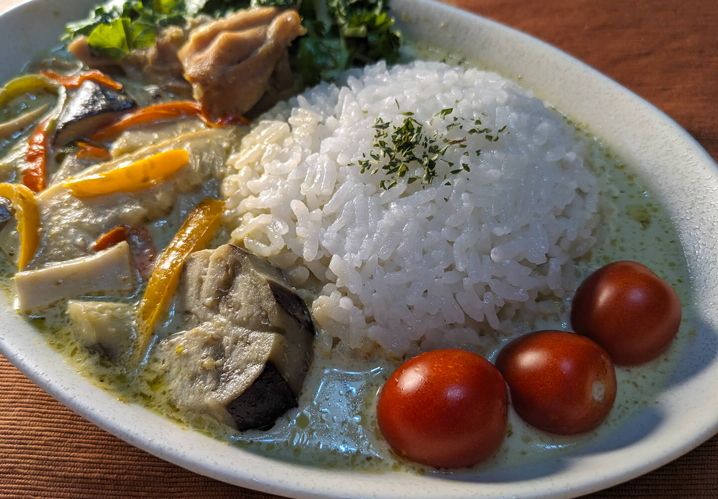 休日は、エスニック料理やインドカレーなどスパイシーな食べ物が好きなのでよく食べに行ったりもしますし、作るのも好きなので気になった料理に色々チャレンジしています。先日は、彩りや食材にもこだわってグリーンカレーに挑戦してみました。